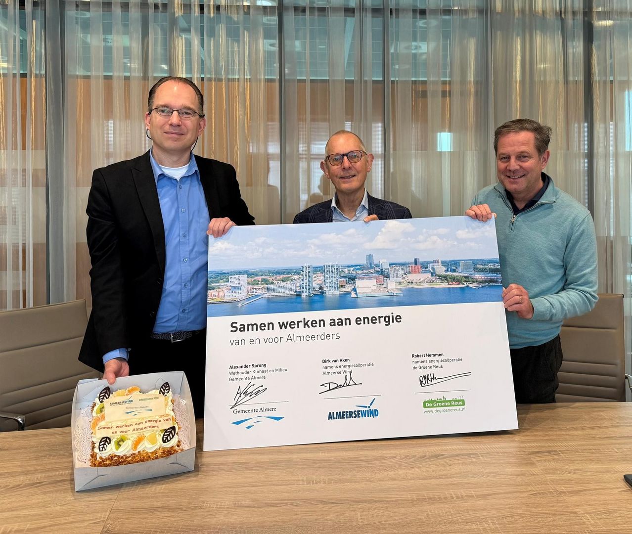 Met het ondertekenen van de meerjarige samenwerkingsovereenkomst leggen energiecoöperaties Almeerse Wind, De Groene Reus en gemeente Almere vast hoe zij samen optrekken om de energietransitie in Almere te versnellen en op te schalen. De samenwerking vormt de basis voor de ontwikkeling van een gezamenlijke organisatie: de energiegemeenschap Almere Energie(K).