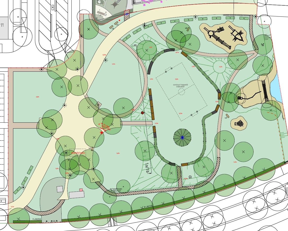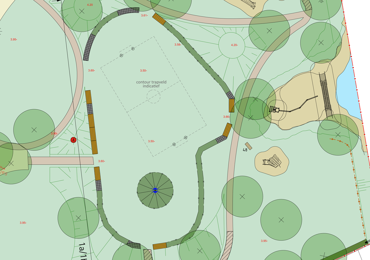 In de tweede werksessie is gekeken waar ruimte is om een bepaalde sport uit te oefenen. Uit deze verkenning bleek dat een trapveldje het best op de archeologische vindplaats kan worden gerealiseerd. Door hoogteverschillen waren andere locaties ongeschikt. Tijdens de laatste bijeenkomst uitten sommigen zorgen over het mogelijk beschadigen van de tipi als daar fanatiek wordt gevoetbald. We delen deze zorg. Het veldje is daarom zo geplaatst in het ontwerp dat de tipi niet achter de doeltjes komt te staan.
