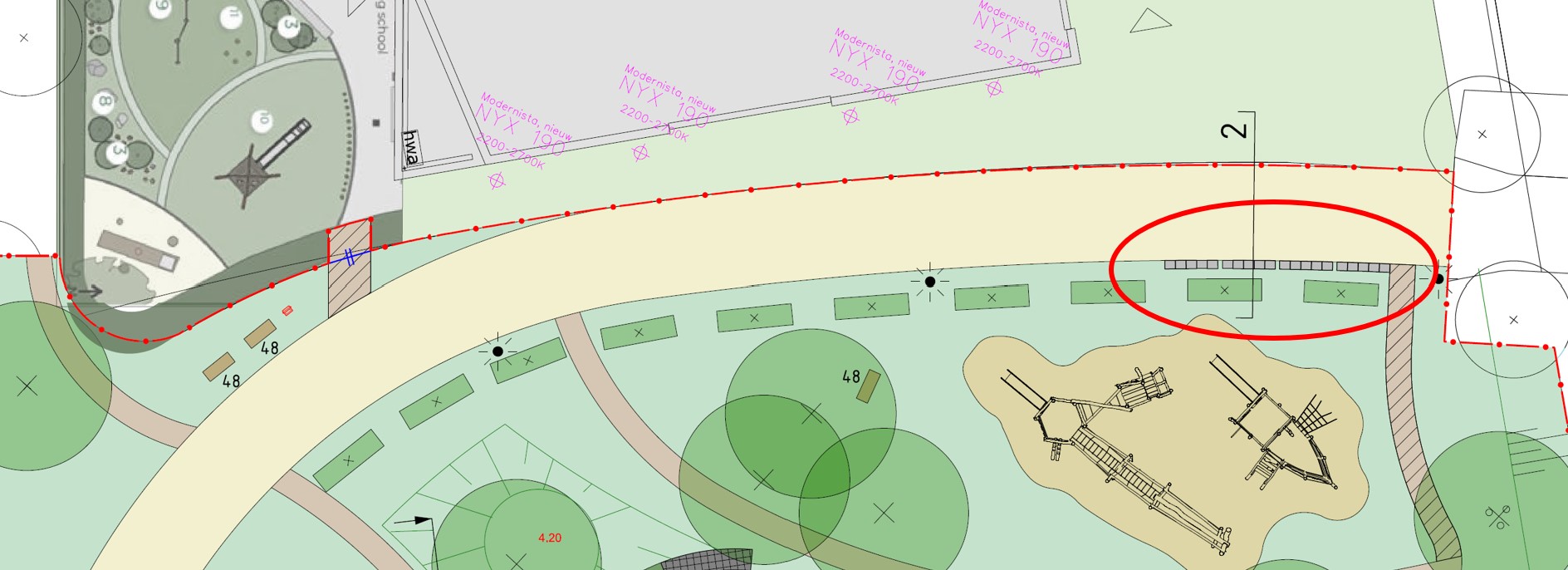 Het schoolplein van Het Universum is recent vernieuwd en heeft naast klimtoestellen nu ook een pannaveld en een tafeltennistafel. In de tweede werksessie werd aangegeven dat het zonde is dat er geen directe verbinding is tussen het schoolplein en De Brink. Schoolpleinen in Almere zijn openbaar en dus ook buitenschooltijd te gebruiken. Maar doordat de entree van het schoolplein niet in de looproute zit, wordt het schoolplein minder goed gebruikt. Terwijl juist de kracht zit in een combinatie van de verschillende soorten sport en spel. Het speelelement van De Brink zou hierdoor worden vergroot zonder dat het ten koste gaat van de open ruimte van De Brink. Daarom hebben we in overleg met Het Universum langs de Dorpsroute een opening in het hek gemaakt om een directe verbinding te maken tussen De Brink en het schoolplein. Naast de opening worden twee bankjes en een prullenbak geplaatst.