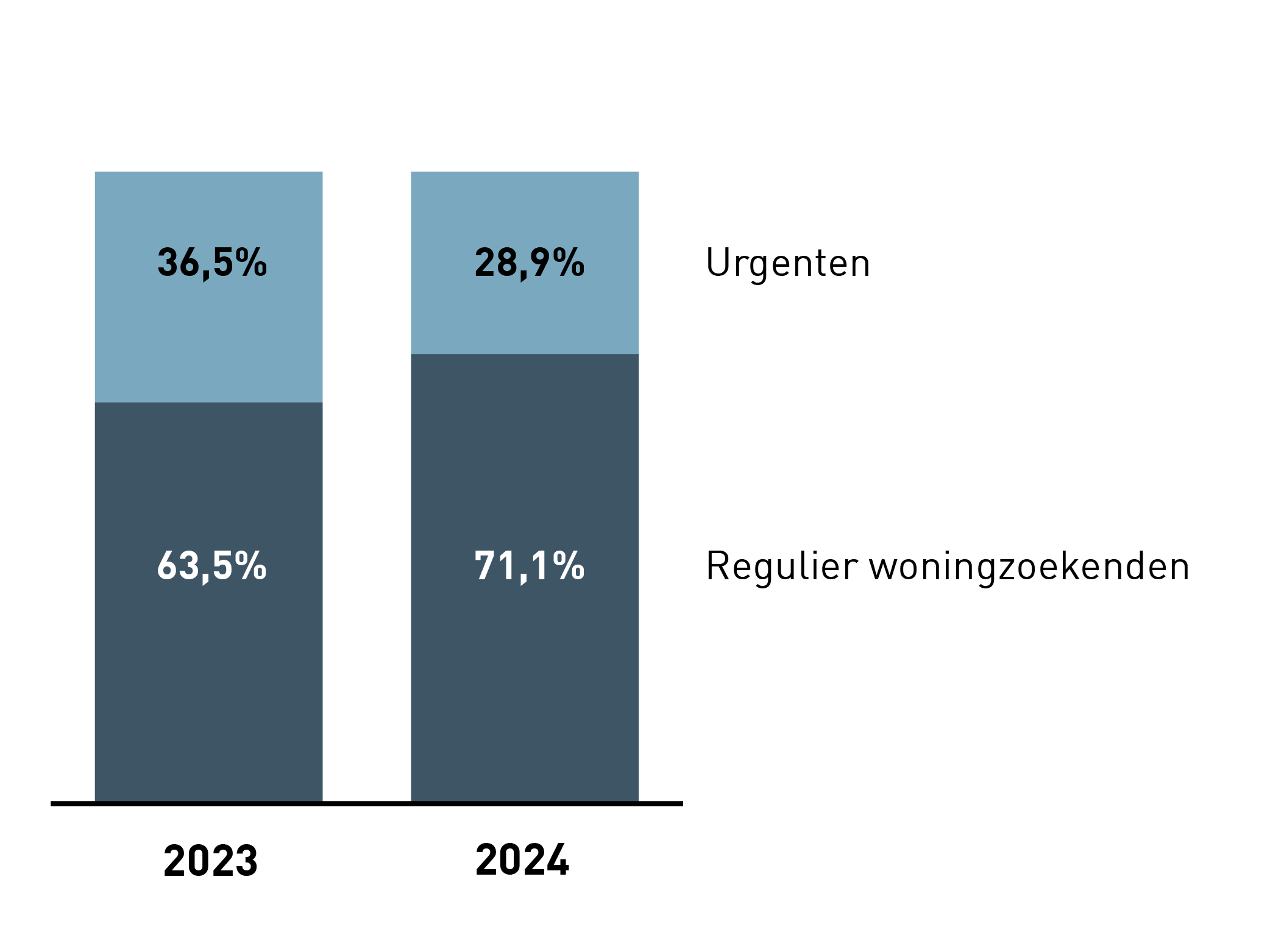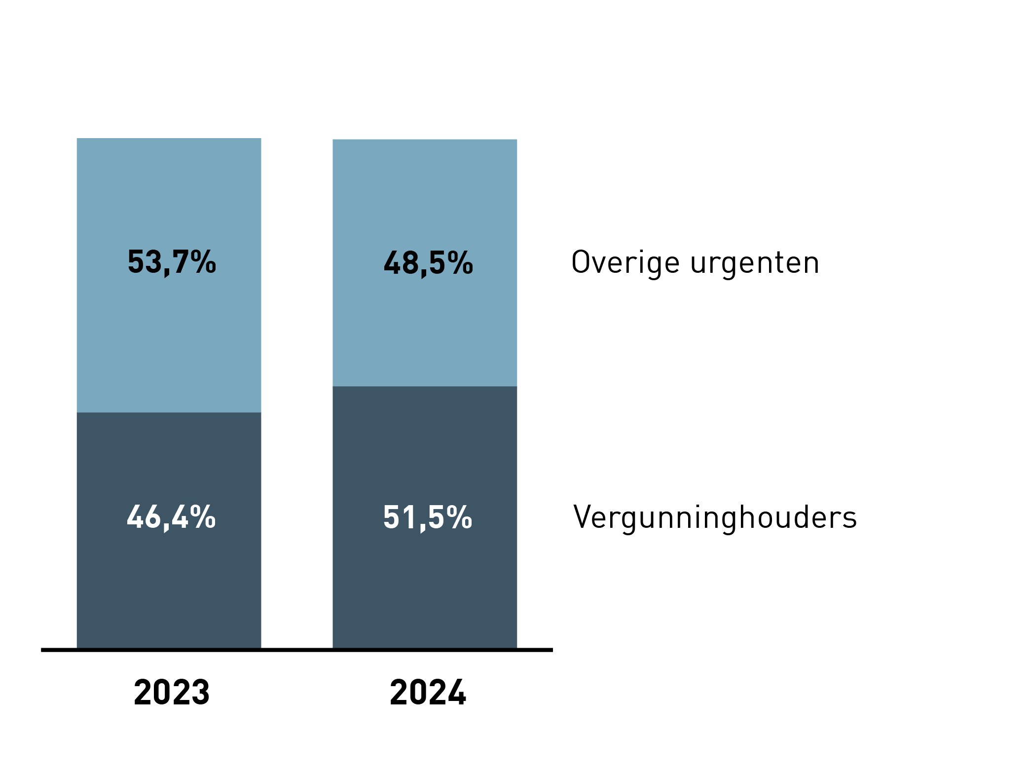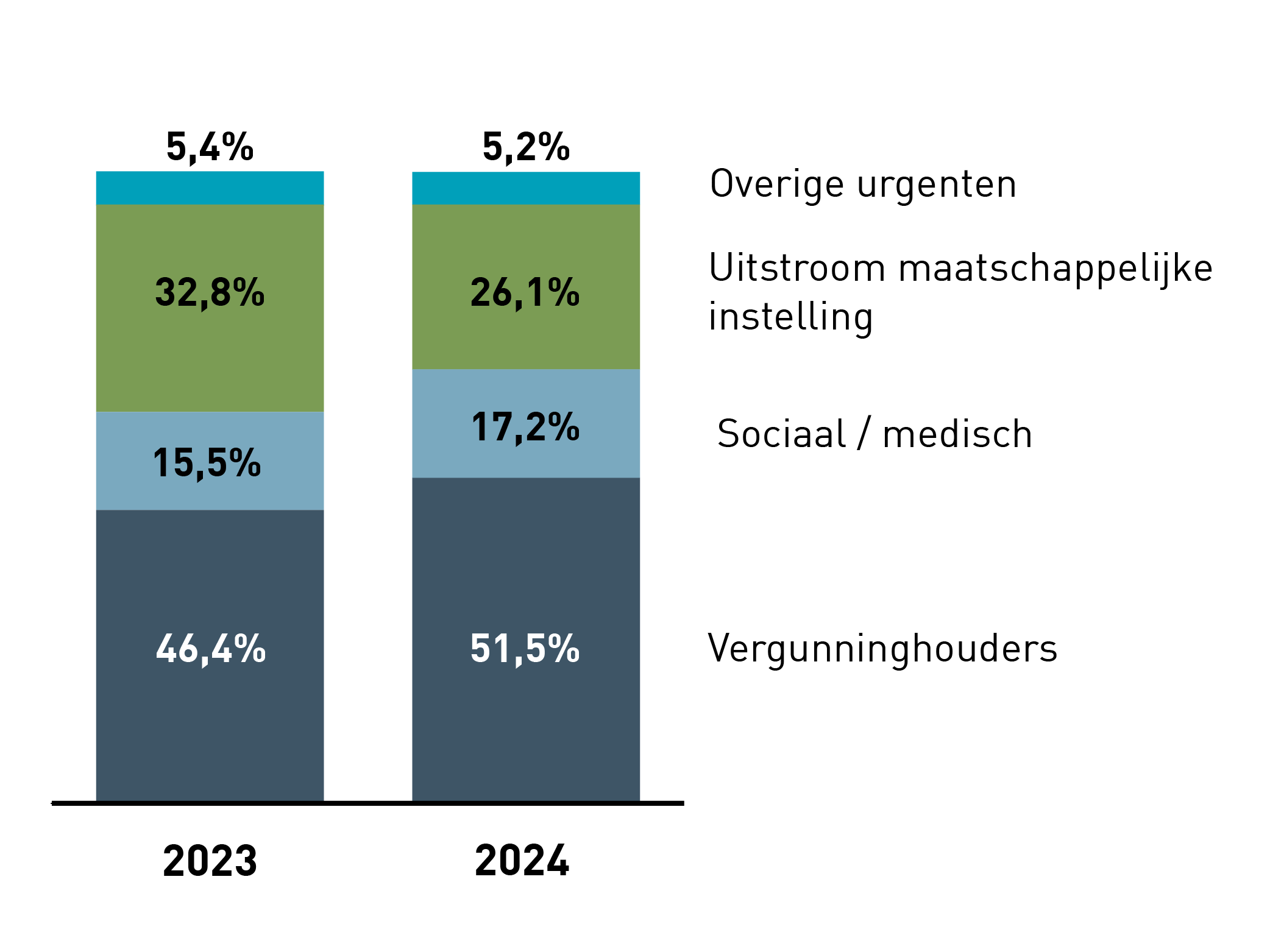 Grafiek 3 toont hoe de beschikbare sociale huurwoningen zijn toegewezen aan vergunninghouders en de overige urgentiegroepen (bron: rapportage WoningNet). Door afrondingsverschillen kan het totaal net iets afwijken van 100%.