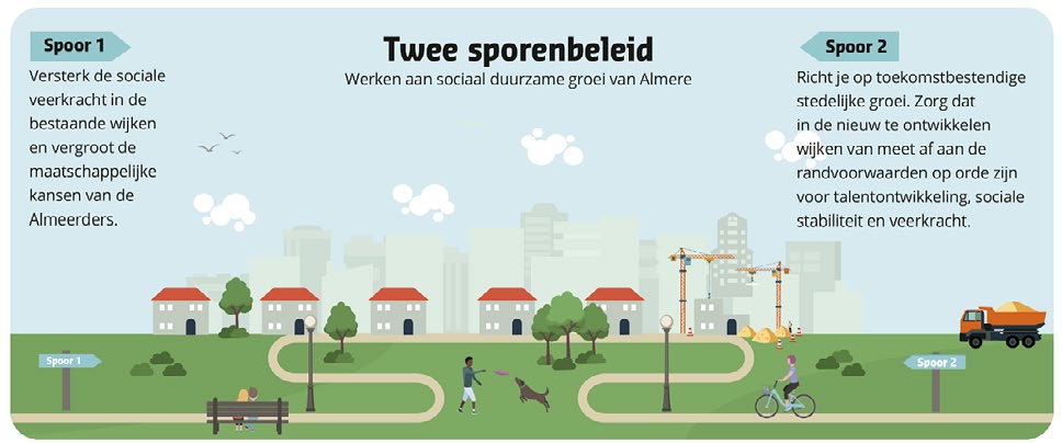 Om te werken aan sociaal duurzame groei van Almere adviseren de onderzoekers in het gemeentebeleid aandacht te hebben voor twee ‘sporen’: